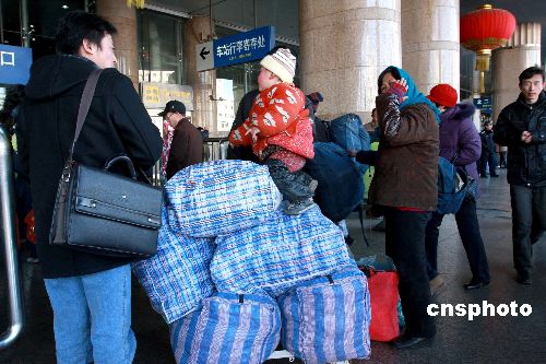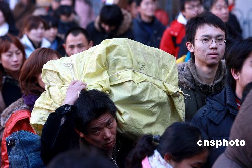 1月11日,為期40天的中國2009年春運(yùn)正式開始,春運(yùn)客流壓力依然很大,客流的剛性需求特征十分明顯,預(yù)計全國鐵路旅客發(fā)送量將達(dá)1.88億人,比去年同期增長8%,日均470萬人,春運(yùn)“一票難求”的問題仍突出。圖為北京西站的客流不斷。