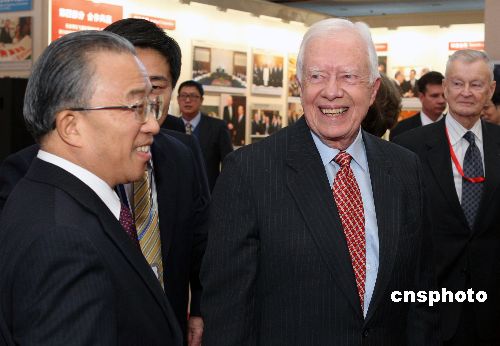 1月12日,中國國務(wù)委員戴秉國在北京陪同來訪的美國前總統(tǒng)吉米·卡特先生,參觀中美建交30周年圖片展覽,重溫兩國建交歷史。中新社發(fā) 宋吉河 攝