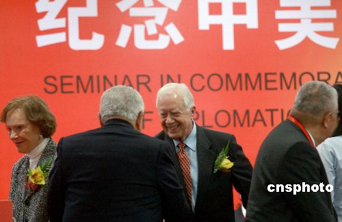 1月12日,紀念中美建交30周年研討會在北京開幕。中國前副總理錢其琛、美國前總統(tǒng)卡特、美國前國務(wù)卿基辛格等在開幕式上致辭。研討會會期兩天,以紀念中美建交30周年為主題,就中美關(guān)系30年發(fā)展的主要經(jīng)驗及對世界的意義、中美關(guān)系未來展望及對發(fā)展兩國關(guān)系的建議等議題進行研討。 中新社發(fā) 鄭雄增 攝