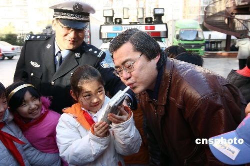 1月14日,北京崇文區(qū)交通支隊(duì)民警為崇文小學(xué)學(xué)生和家長(zhǎng)講授交通安全課,家長(zhǎng)當(dāng)場(chǎng)向自己的孩子簽署交通安全承諾書,承諾在節(jié)日期間不酒后駕車、不闖紅燈、不疲勞駕駛,與孩子度過安全、快樂的假期。圖為小學(xué)生學(xué)習(xí)用酒精監(jiān)測(cè)儀測(cè)試自己的家長(zhǎng)。中新社發(fā) 杜洋 攝