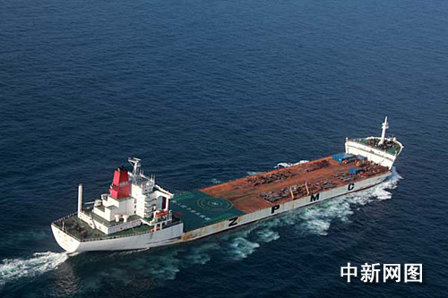 被護(hù)商船“振華十三”號(hào)在甲板上寫著“向人民子弟兵致敬”幾個(gè)白色大字。