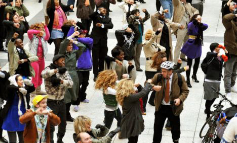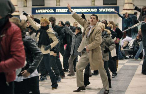 跳舞的人群中既有前來英國觀光的旅行者,也有地鐵站的工作人員,他們?cè)谝凰查g聚集,有組織的表演hip-pop、迪斯科或者舞廳舞步動(dòng)作,幾分鐘后又都忽然解散。