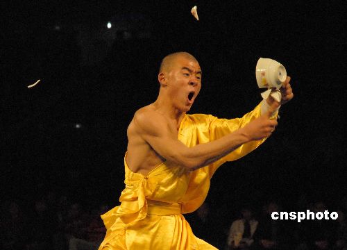 圖中武僧用一根手指連破十來(lái)個(gè)瓷碗,令觀眾嘆為觀止。中新社發(fā) 劉冉陽(yáng) 攝