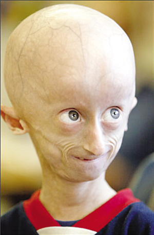 據(jù)報(bào)道,現(xiàn)年14歲的美國男孩塞斯·庫克是美國華盛頓州西雅圖附近達(dá)令頓地區(qū)人,和《返老還童》中的男主人公本杰明一樣,他出生時(shí)就沒有毛發(fā),皮下脂肪退化,皮膚血管清晰可見,如同一名70歲老人一般衰老。當(dāng)塞斯18個(gè)月大時(shí),他被診斷出患有罕見的早衰癥。37歲的父親凱爾·庫克說:“一開始我們聽到這個(gè)消息簡直驚呆了,我們不敢相信這一切!