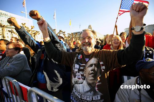圖為舊金山人歡慶奧巴馬就職美國總統(tǒng)。中新社發(fā) 陳鋼 攝