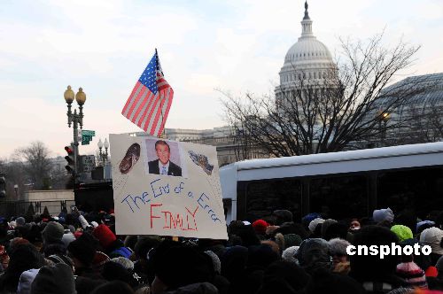 圖為在國家大草地的觀禮民眾打出布什被扔鞋的窘相并寫著:“錯誤的最后終結”!中新社發(fā) 邱江波 攝