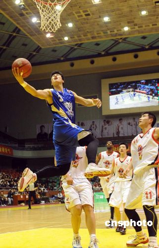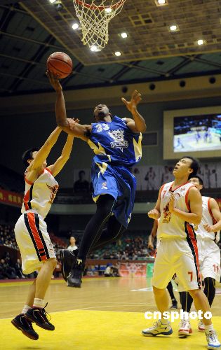 東莞馬可波羅隊(duì)球員哈里斯(中)上籃,山東隊(duì)球員王剛(左)攔截。