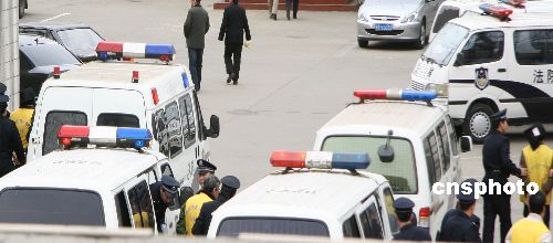 圖為當日中午,接押張玉軍、張彥章等人的警車駛回法院后院,法警押送嫌疑人進入法院。中新社發(fā) 翟羽佳 攝