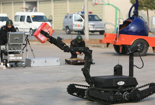 會搬運炸彈的機器人:在武漢舉行的一場反恐演練中,武警戰(zhàn)士使用機器人搬運“炸彈”。