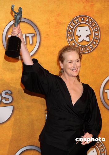 號(hào)稱奧斯卡主要風(fēng)向標(biāo)的第十五屆美國(guó)演員工會(huì)獎(jiǎng)(SAG)一月二十五日晚在洛杉磯揭曉。美國(guó)老牌影星梅麗·史翠普(又譯梅麗爾·斯特里普)憑借《虐童疑云》(Doubt)奪得電影類劇情片最佳女主角獎(jiǎng)。梅麗·史翠普剛剛獲得奧斯卡最佳女主角提名,從而以十五次入圍奧斯卡締造了歷史紀(jì)錄。中新社發(fā) 張煒 攝
