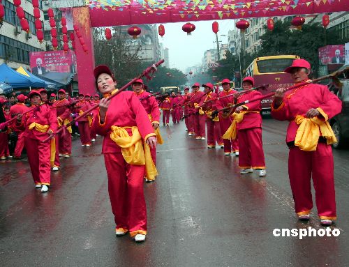1月26日,正月初一,四川華鎣市舉行民俗文化排街展演,10余個精彩地方民俗節(jié)目,吸引了數(shù)萬市民觀看。中新社發(fā) 楊天軍 攝