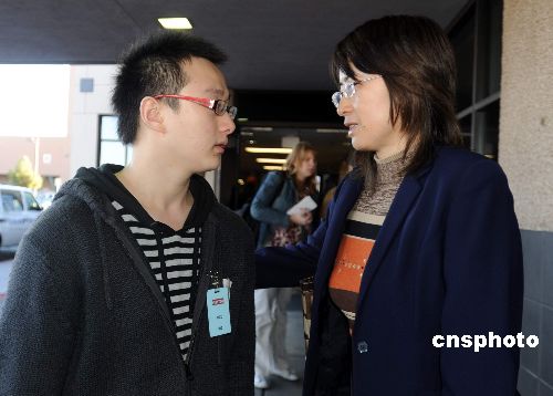 當?shù)貢r間一月三十一日下午,中國駐洛杉磯副總領事黃曉健(右)在內華達大學醫(yī)療中心和中國游客小洪(左)交談。小洪是沒有參加大峽谷一日游而躲過一劫的五名中國游客之一,而小洪的父母受傷嚴重,尤其是母親傷勢危重。中國游客當?shù)貢r間一月三十日下午在美國亞利桑那州的九十三號公路上遭遇嚴重車禍,造成七人遇難、十人受傷。中新社發(fā) 張煒 攝