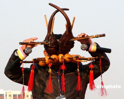 同時演奏九個葫蘆絲。中新社發(fā) 玉龍 攝