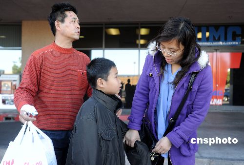 當?shù)貢r間2月1日下午2時左右,遭遇車禍的吳守桂(左)、包瑞華(右)夫婦帶著八歲的兒子吳雙走出拉斯維加斯大學醫(yī)療中心(UMC),乘車前往酒店。吳守桂說,他們現(xiàn)在最大的心愿就是盡快回國,好好調整心理,繼續(xù)療傷。一月三十日下午,一輛載有中國游客的旅游車在美國亞歷桑那州發(fā)生車禍,造成七死十傷。吳守桂稱自己是不幸中的萬幸,一家三口是所有乘客中傷勢最輕的,夫婦倆昨天就出院了,今天八歲的兒子也順利出院。中新社發(fā) 張煒 攝