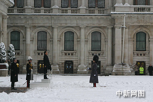 倫敦當(dāng)?shù)貢r間二月二日上午八時三十分許,正在對英國進行正式訪問的中國總理溫家寶,踏雪出席布朗首相在外交部舉行的歡迎儀式。圖為溫家寶在觀禮臺上檢閱儀仗隊。 中新社記者 張朔 攝