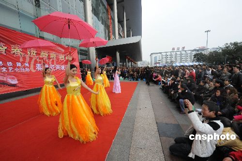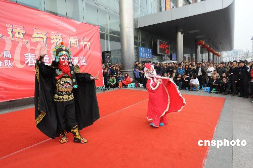 2009年2月3日,成都鐵路局文藝演出小分隊來到成都火車站進行慰問演出,為等候乘車的旅客們表演了歌舞、獨唱、川劇變臉等節(jié)目,祝大家愉快出行、一路順風。中新社發(fā) 曹寧 攝