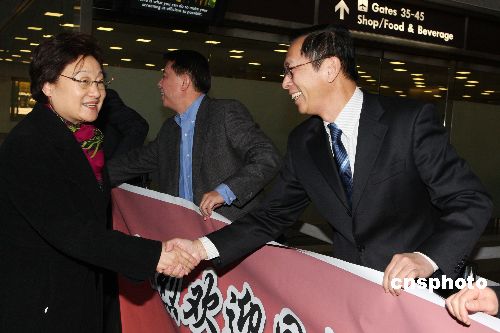 中國(guó)駐美大使周文重(左)前往機(jī)場(chǎng),迎接應(yīng)邀前來(lái)的中國(guó)國(guó)務(wù)院僑辦主任李海峰及"文化中國(guó)·四海同春"藝術(shù)團(tuán)一行抵達(dá)華盛頓。