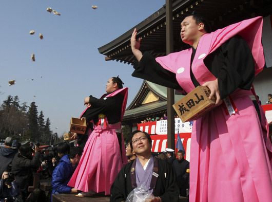 2月3日,在日本靜岡縣熱海市舉行了“撒豆子”儀式,炒熟的黃豆在日本被稱為“福豆”,儀式主辦方請來名人站在高處,將炒熟的黃豆拋向人群,以驅邪迎福,祈愿身體健康。