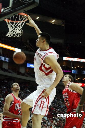 當(dāng)?shù)貢r間2月4日,火箭隊(duì)主場107比100擊敗公牛隊(duì),取得兩連勝的同時也保持了對公牛連續(xù)三年不敗的紀(jì)錄。姚明12投9中,8個籃板,4次蓋帽,貢獻(xiàn)全場最高的28分。圖為姚明扣籃。中新社發(fā) 歐文 攝