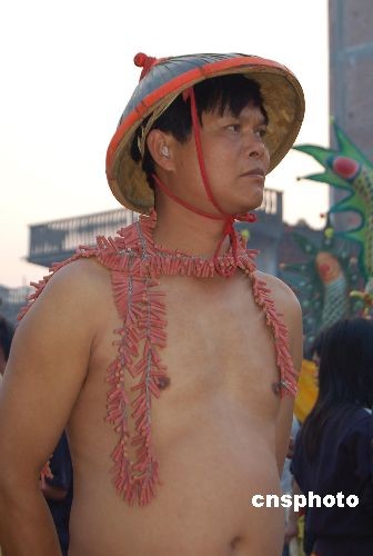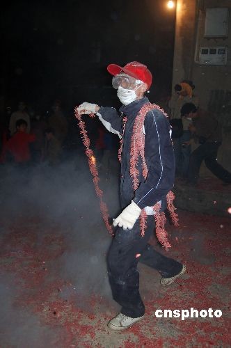 廣西賓陽(yáng)“炮龍節(jié)”上全副武裝的“炸龍人”。