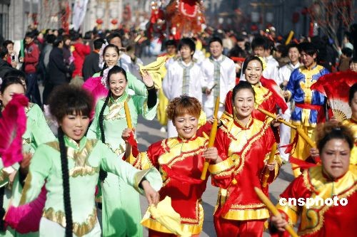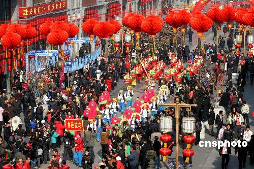 2月9日上午,來(lái)自北京、河北、山東等3個(gè)省市的12支花會(huì)隊(duì),在前門大街舉行“傳統(tǒng)民間花會(huì)踩街”活動(dòng),喜迎正月十五元宵節(jié)的到來(lái)。踩街是一種中國(guó)傳統(tǒng)民間民俗藝術(shù)表演形式,類似國(guó)外的花車游行,表演隊(duì)伍邊行進(jìn)邊表演,游客沿途觀看;〞(huì)隊(duì)從正陽(yáng)門箭樓南側(cè)和前門五牌樓出發(fā),16只南獅和北獅為大隊(duì)人馬開道,隨后中幡、旱船、二魁摔跤、地秧歌、鼓子秧歌等將依次向珠市口行進(jìn)。