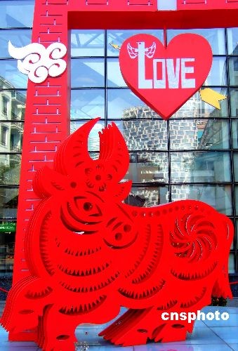 2009年2月12日,情人節(jié)前夕,上海新天地為大型牛年圖騰,冠上了“LOVE”字樣,飾以丹心和愛情鳥形象,以此慶祝情人節(jié)到來,祈望幸福之家“情愛展翅”、“愛情長!薄V行律绨l(fā) 蔣振雄 攝