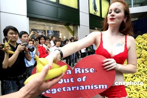 二月十三日,香港善待動物組織的兩名性感美女在街頭派發(fā)香蕉,提倡素食文化理念。中新社發(fā) 張勤 攝