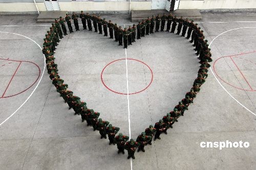 浙江溫州邊防支隊(duì)新兵連戰(zhàn)士們?cè)诨@球場(chǎng)上組成一個(gè)美麗的軍綠色“心”形圖案,給遠(yuǎn)方的父母和女友送去祝福。中新社發(fā) 吳水斌 攝