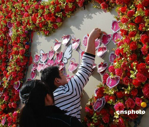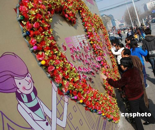 山東濱州街頭佇立起一長達10米、寬4米的巨大“情人許愿墻”,供來來往往的行人抒寫對愛人、情侶、朋友的心靈物語與美好祝愿。中新社發(fā) 梁寶海 攝