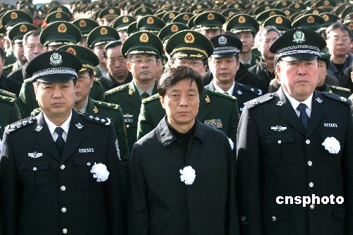 圖為央視臺長趙華勇(中)和北京市公安局局長馬振川(右)等參加追悼會。中新社發(fā) 富田 攝
