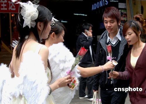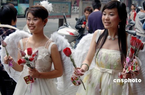 二月十四日情人節(jié),為搶占商機,兩名由商家女服務生裝扮成的“天使”,在福州市區(qū)街頭向過往的男女青年贈送玫瑰花,成為街頭亮麗一景。中新社發(fā) 劉可耕 攝