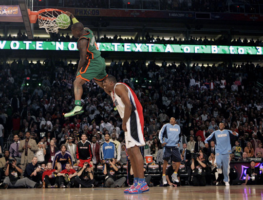 中新網(wǎng)2月15日電 北京時間2月15日,NBA全明星周末繼續(xù)進行,其中深受全世界球迷喜愛的扣籃大賽火爆上演。身高只有1米70的“小土豆”內特-羅賓遜在決賽中做出了飛躍上屆扣籃大賽冠軍、身披“超人”斗篷的霍華德后扣籃的動作,這個被稱為“飛躍超人”的扣籃使羅賓遜繼2006年后第二次獲得扣籃王,成為2009年全明星周末的扣籃冠軍。