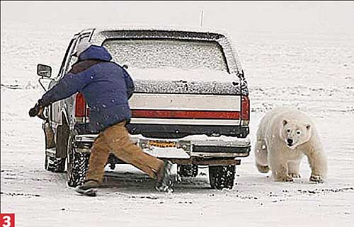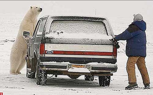 美國阿拉斯加州一名男子在大雪天駕車出行時(shí),不慎遇到一只強(qiáng)壯的北極熊。這只北極熊饑餓難耐,想拿這名男子當(dāng)“晚餐”,于是北極熊和這名男子在雪地里繞著車展開一場(chǎng)“貓捉老鼠”的驚險(xiǎn)游戲。最終男子成功擺脫了北極熊的追逐,死里逃生。
