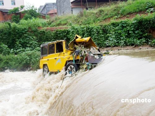 08年6月11日,一輛載人吉普車(chē)在通過(guò)浙江浦江縣七里村一座小橋時(shí)為避讓對(duì)面行人,不幸連車(chē)帶人墜入水中。吉普車(chē)隨著水流輾轉(zhuǎn)“漂流”1000多米,最終擱淺在溪中下游一座攔水壩處。一位青年正好路過(guò),看到有車(chē)子落水,他急忙趕了過(guò)去,當(dāng)他看到司機(jī)托起坐在副駕駛室里一名女子時(shí),立即將該女子拉了上來(lái)。一會(huì),司機(jī)也從車(chē)?yán)镢@了出來(lái),因水勢(shì)兇猛,吉普車(chē)一路翻轉(zhuǎn),順著溪流沖向下游,他們只能眼睜睜地看著吉普車(chē)隨水飄走。中新社發(fā) 許康平 攝