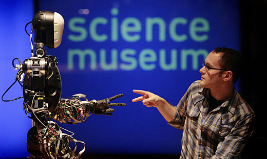 2月17日,在英國倫敦的科學博物館,一名工作人員與一個名為BERTI的機器人在玩“剪刀、石頭、布”的游戲。設計這個機器人的初衷是幫助科學家研究未來人與機器人如何互相影響。