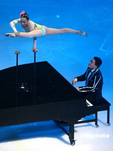 圖為在開幕式上,鋼琴上的雜技演出技驚四座。中新社發(fā) 富田 攝
