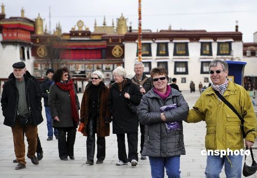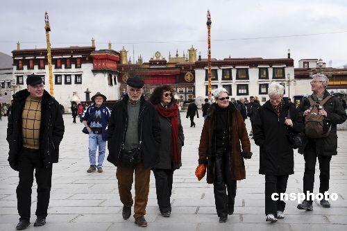 2月26日,中國藏歷年初二,十多名德國游客在西藏拉薩大昭寺前游覽,他們是通過中國國際旅行社總社組團來到西藏的。旅游日程包括參觀拉薩著名景點和藏民家庭旅館體驗住宿,德國游客表示藏民的熱情好客給他們留下了深刻印象。中新社發(fā) 廖攀 攝