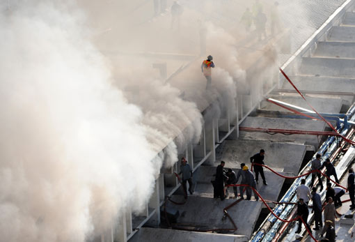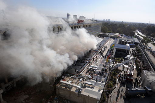 2月26日,位于巴基斯坦首都伊斯蘭堡的萬豪酒店發(fā)生火災,造成4人受傷。圖為消防人員正在滅火。