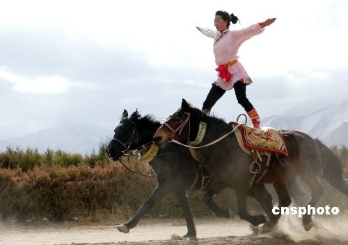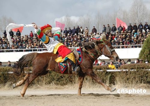 2月27日,中國(guó)藏歷年初三,在拉薩市北郊的賽馬場(chǎng),傳統(tǒng)賽馬與馬術(shù)表演活動(dòng)隆重舉行,身懷絕技的騎手們?yōu)槌汕先f(wàn)的觀眾表演了精彩絕倫各種節(jié)目。中新社發(fā) 周波 攝