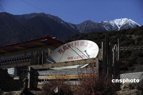 2009年初春,西藏林芝米林縣農村的廣播電視“村村通”工程衛(wèi)星天線。西藏自治區(qū)廣播電視“村村通”工程2000年啟動以來,行政村至少可接收兩套以上電視節(jié)目和一套以上廣播節(jié)目,規(guī)模較大的行政村可收看4套以上電視節(jié)目。農牧民聚居密度大的地方,還安裝了農村小片網(wǎng)有線電視,可收看6套以上的電視節(jié)目。中新社發(fā) 廖攀 攝