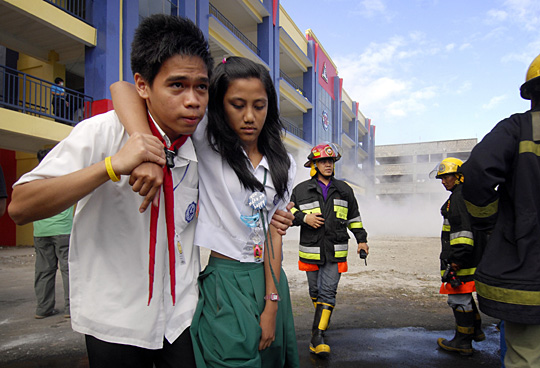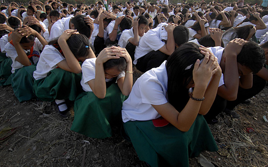 2月27日,在菲律賓大馬尼拉區(qū)的奎松城,參加地震演練的中學(xué)生們蹲在開(kāi)闊地帶用雙手護(hù)住頭部,同時(shí)他們的同學(xué)在協(xié)助消防部門(mén)救助“傷員”。菲律賓在全國(guó)范圍內(nèi)舉行地震演練,以提高抵御災(zāi)害的能力和突發(fā)事件救援的反應(yīng)速度。