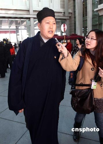 3月1日,赴北京參加“兩會(huì)”的全國政協(xié)委員、四川省道教協(xié)會(huì)會(huì)長、青城山天師洞道觀道長唐誠,剛一抵達(dá)北京機(jī)場(chǎng)就被記者追訪。2OO9年全國“兩會(huì)”即將開幕,代表、委員們已開始陸續(xù)抵京報(bào)到。中新社發(fā) 杜洋 攝