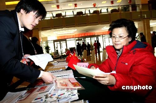 3月2日,參加全國政協(xié)十一屆二次會議的全國政協(xié)委員陸續(xù)向大會報到。圖為著名演員宋春麗在報到處領(lǐng)取會議材料。中新社發(fā) 傅丹丹 攝