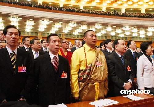 全國(guó)政協(xié)十一屆二次會(huì)議3月3日下午在人民大會(huì)堂隆重開(kāi)幕,與會(huì)委員在開(kāi)幕大會(huì)上高唱國(guó)歌。今年全國(guó)“兩會(huì)”在議程安排方面做出重大調(diào)整,在開(kāi)幕式和閉幕式上,將原來(lái)的“奏國(guó)歌”改為“唱國(guó)歌”。這一改變采納了代表和委員的議案和提案。中新社發(fā) 宋吉河 攝