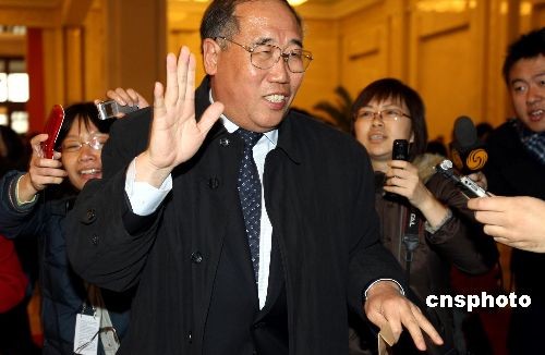 3月3日下午,國家發(fā)改委副主任解振華在參加全國政協(xié)十一屆二次會議開幕會時(shí),被媒體圍堵熱問節(jié)能減排問題。中新社發(fā) 傅丹丹 攝