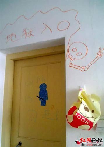 新婚快樂(lè)!天堂入口,地獄入口,照妖鏡……臨近寒假,某大學(xué)的一群女生集體在宿舍墻壁上涂鴉,創(chuàng)作了一批讓她們沾沾自喜的“杰作”。有好事者把“杰作”拍下來(lái),發(fā)到紅網(wǎng)論壇,引來(lái)上萬(wàn)網(wǎng)友回帖無(wú)數(shù)。