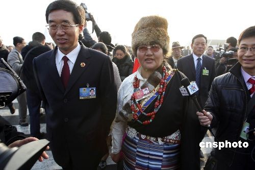 3月5日上午,十一屆全國(guó)人大二次會(huì)議在北京人民大會(huì)堂開幕,來自西藏的全國(guó)人大代表色珠與列席大會(huì)開幕會(huì)的西藏自治區(qū)人民檢察院檢察長(zhǎng)張培中步入會(huì)場(chǎng)。中新社發(fā) 盛佳鵬 攝