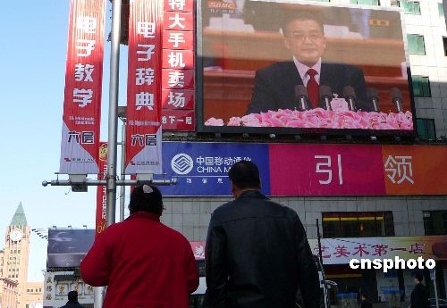 3月5日上午,十一屆全國人大二次會(huì)議在北京人民大會(huì)堂隆重開幕。王府井大街上的電視熒屏播放的溫總理作《政府工作報(bào)告》的直播吸引了市民的目光。中新社發(fā) 玉龍 攝