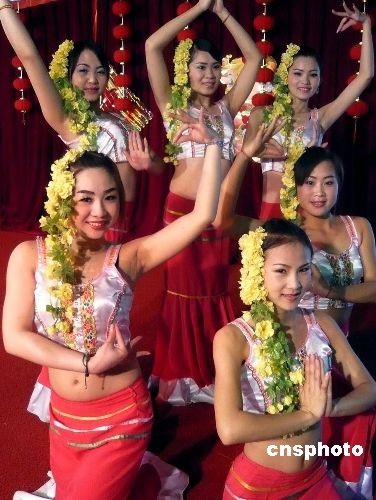 3月7日,為慶!叭.八”國際婦女節(jié)的到來,北京植物園舉行賞花送花活動。特設的“女人花”展區(qū)內展示的花卉名稱中均帶有“女”字:如“小葉女貞”、“舞女蘭”、“美女櫻”等。每位在熱帶展覽溫室參觀的女士,可以得到一束美麗的康乃馨。圖為云南傣族姑娘頭戴鮮花為參加活動的游客表演舞蹈。中新社發(fā) 錢興強 攝