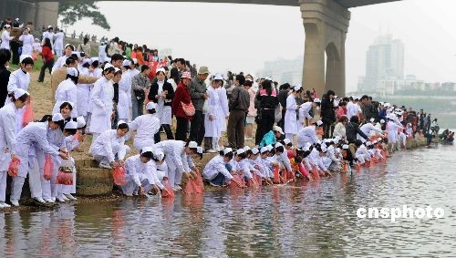 三月八日,為慶祝三八國際勞動婦女節(jié),廣西南國早報網(wǎng)組織南寧市女性在南寧母親河——邕江放生百萬尾魚苗。中新社發(fā) 蔣雪林 攝